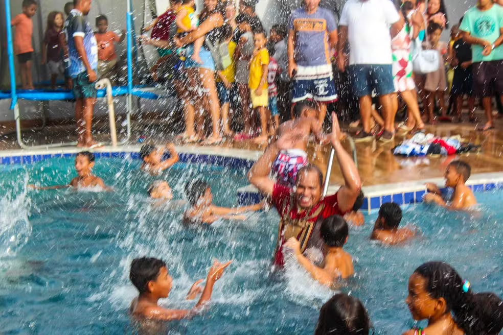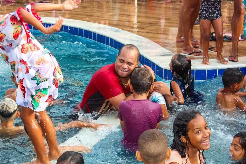 A alegria estampada no rosto das crianças era evidente. Rapidamente, a meninada caiu na piscina, correu para o pula-pula. Chulapa, feliz da vida, falou sobre esse evento: